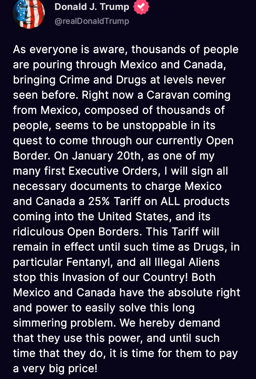 In a post on his Truth Social platform, Trump wrote, “Both Mexico and Canada have the absolute right and power to easily solve this long simmering problem. It is time for them to pay a very big price!”