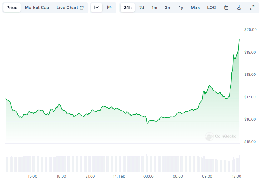 The Official Trump (TRUMP) meme coin has made headlines with an impressive price surge, skyrocketing by approximately 15% in just one hour. This rally has pushed the coin’s value past $19.50 for the first time in nearly two weeks, coinciding with a broader revival in the meme coin sector.