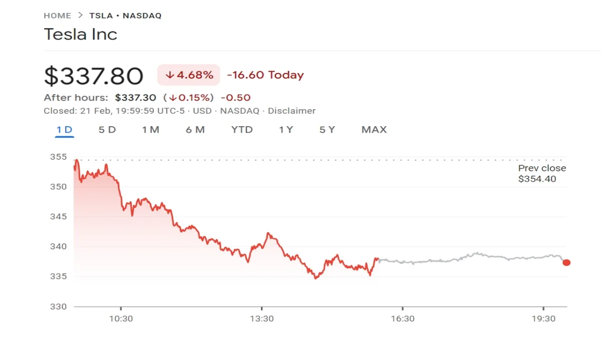 Tesla Inc witnessed a significant drop in its stock price, falling by 4.68%. This decline comes amid a broader market sell-off and growing concerns about the company's future prospects. The stock closed at $328.50, down from its previous close of $345.80.CEO Elon Musk's Washington Commitments Raise Concerns](https://www.panasiabiz.com/wp-content/uploads/2025/02/Screenshot_22-2-2025_14493_www.google.com_-1024x576.webp)