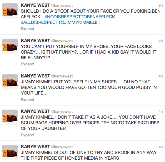 Kanye began his twitter attack on Kimmel by telling Kimmel that he was out of line spoofing the “first piece of honest media in years”. The tweets continued to get incredibly bizarre till Kanye was openly hurling abuses at Kimmel.