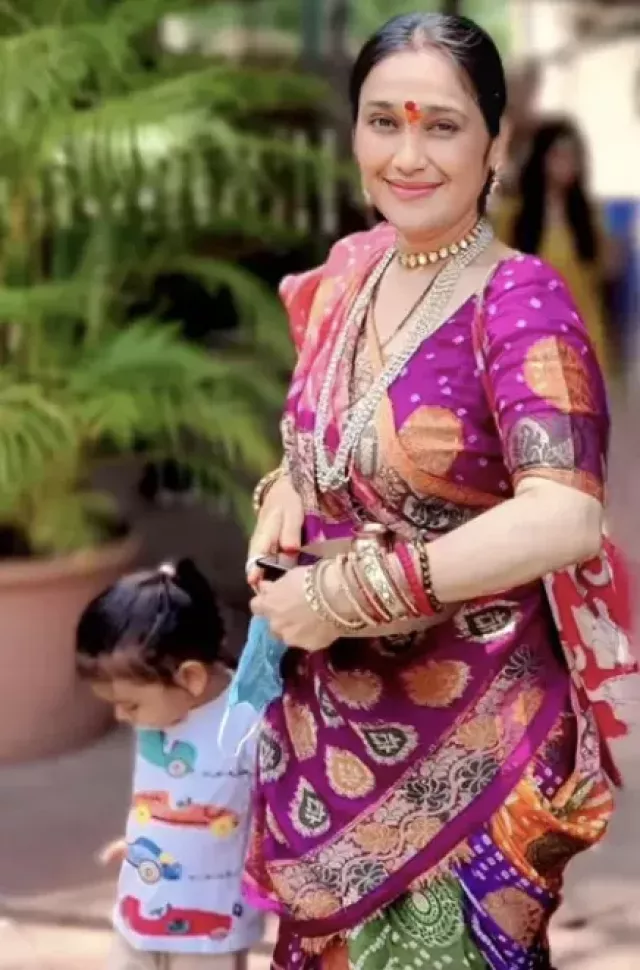In the image, Disha is seen in a traditional Gujarati bandhani saree, smiling warmly while holding her daughter. The photo, shared by fan pages, shows a noticeable transformation after nearly eight years away from the spotlight.