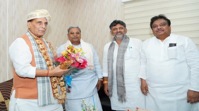 Siddaramaiah and DK Shivakumar meet Rajnath Singh in a high-level meeting today to discuss Karnataka’s strategic development agenda.