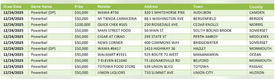 The Christmas Eve drawing proved to be incredibly lucrative for local lottery fans. Out of the millions of entries, 10 winning Powerball tickets sold in New Jersey matched enough numbers to secure a $50,000 prize each. Additionally, one incredibly lucky ticket holder doubled their luck, securing a $100,000 payout. These winners correctly matched four of the five white balls and the red Powerball, proving that you do not need the jackpot to see a massive return on a small investment.