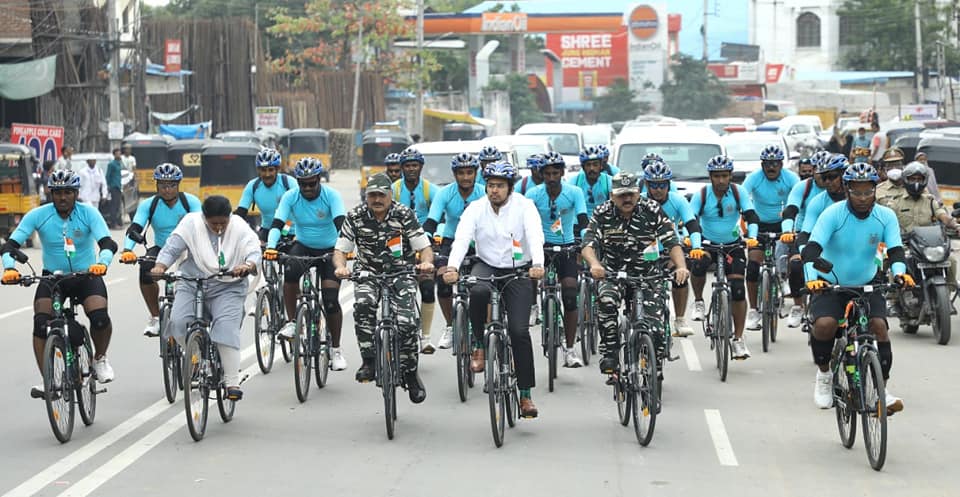 Tejasvi Surya, Indian politician, RSS swayamsevak, and lawyer serving as the Member of Parliament in the 17th Lok Sabha from the Bharatiya Janata Party Joined CRPF’s #AzadiKaAmritMahotsav rally with a 10 km ride in Hyderabad today