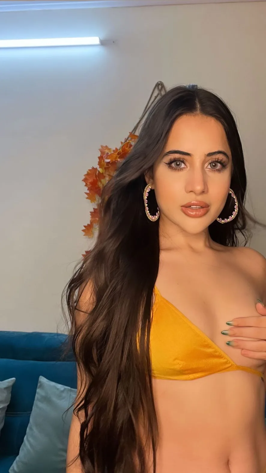 Urfi Javed Dress: Instagram sensation Urfi (Uorfi) Javed, who is known for her bold photoshoots, seems to have crossed all limits in her latest pics. The actress exposed one of her breasts by posing in a mustard bralette; she covered her modesty with her hands while posing for the pics. The Bigg Boss OTT fame Urfi shared two daring pics on Instagram, where she can be seen in a risqué pose covering her modesty with her hand.