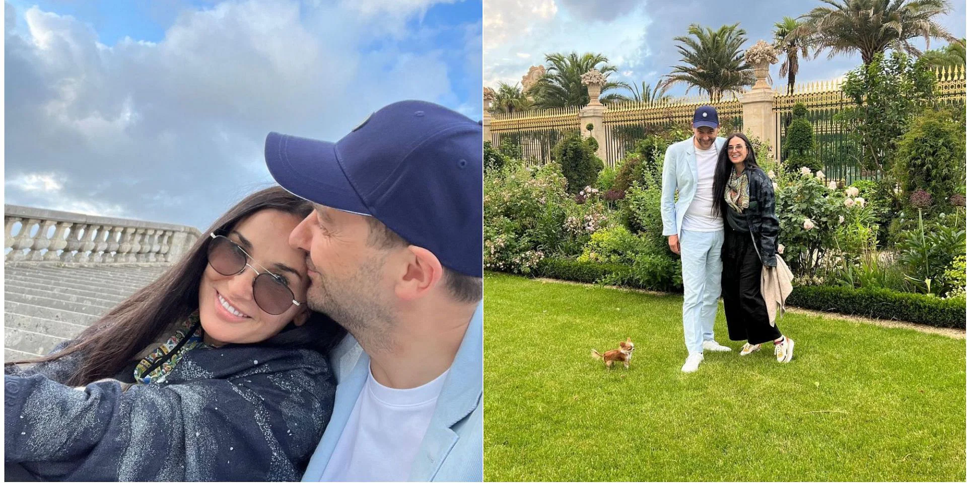 In the second shot, they were sitting closed with the Swiss chef and N.Y.C.-based restaurateur resting his lips on Moore’s forehead. In the third one, the pair is posing together amid lush greenery with “the queen,” a.k.a. the actress’ pup pilaf.
