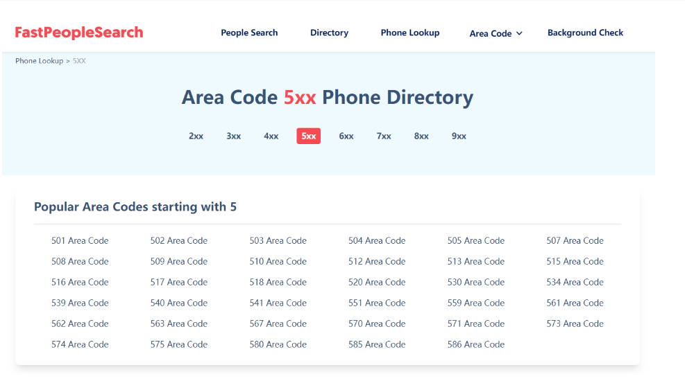 Go to the area code option on Fast People Search and click on area code 5xx and all the area codes will appear on your screen. Now, click on the area code of the person you will get various phone number prefixes in that area code. Skim through them to look up a complete phone number via an area code starting with 5.