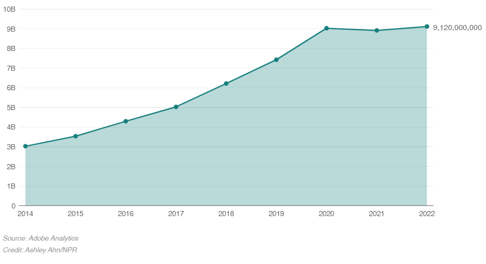 According to Adobe Analytics, the $9.12 billion figure is up from $8.92 billion in 2021 and $9.03 billion the previous year.