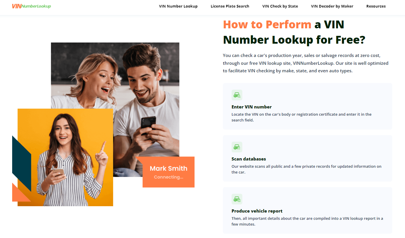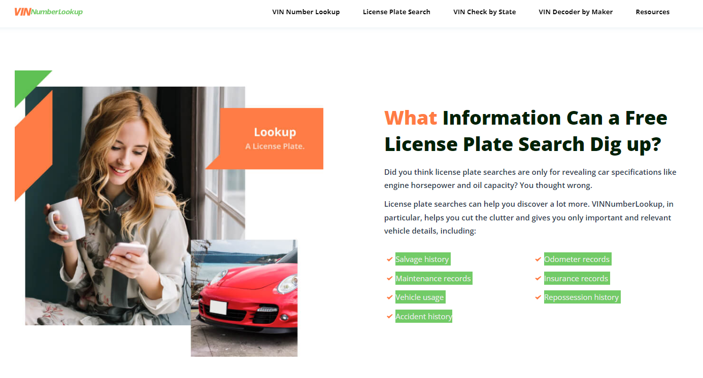 VINNumberLookup can help you learn more about your car through a VIN check with a free vehicle history report, but also help you get access to the car’s history through a license plate number check online.