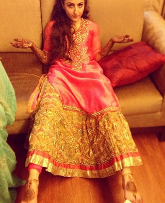Soha Ali Khan was seen in a stunning avatar during the mehendi ceremony. She wore an inner peshwaz, an over kurti in pink chanderi yolk and a Jaipuri lehran odhni.