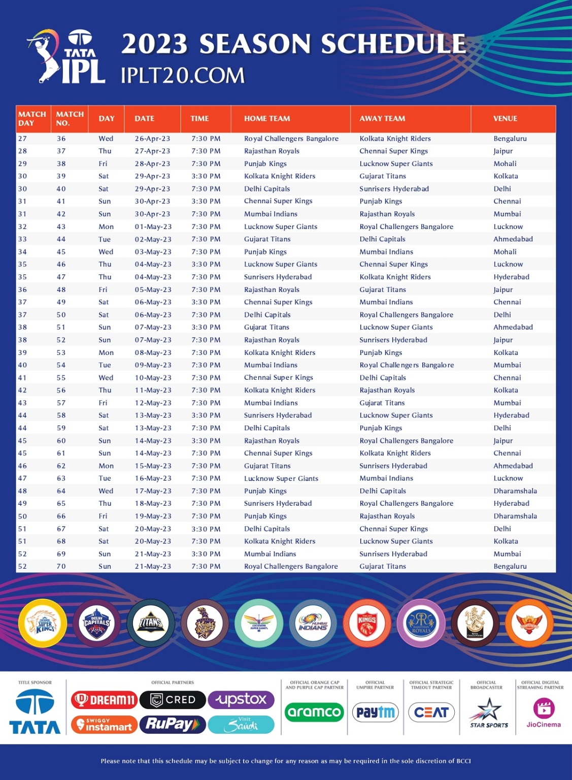 The date and time of each match were announced by the Board of Control for Cricket in India (BCCI).