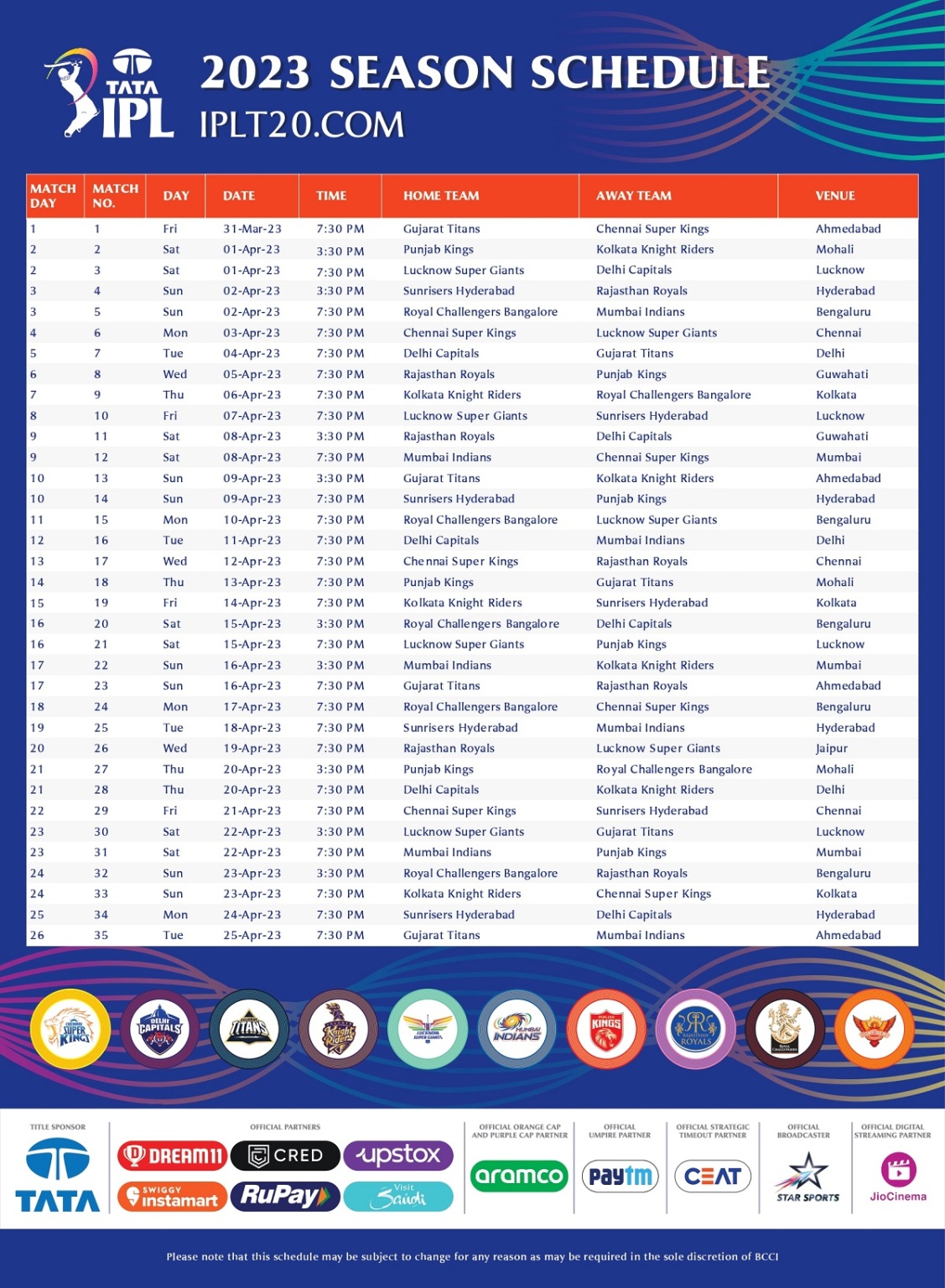 The date and time of each match were announced by the Board of Control for Cricket in India (BCCI).