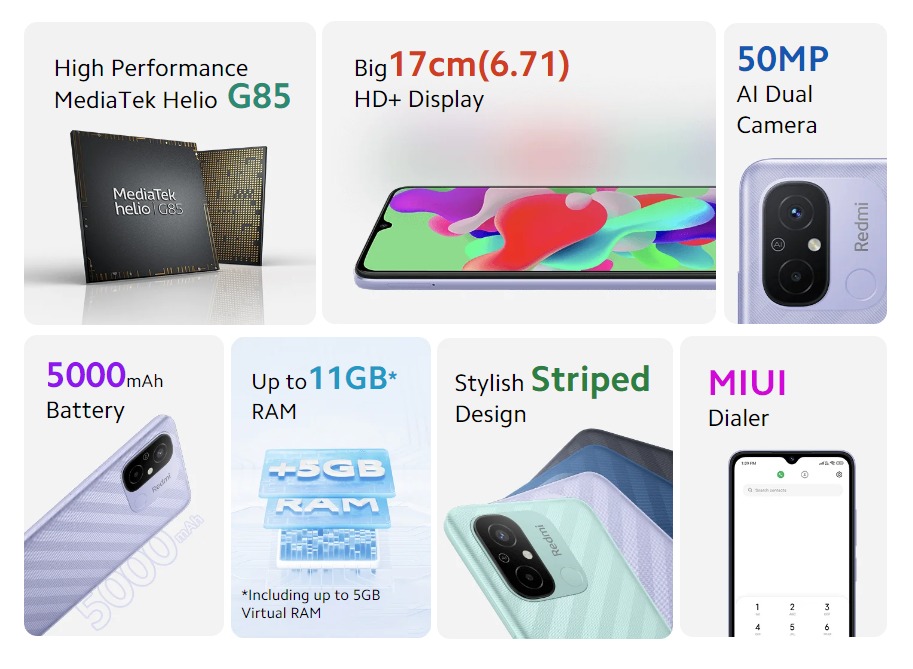 The phone is powered by a MediaTek Helio G88 processor paired with up to 6GB of RAM and 128GB of internal storage. The phone also supports a dedicated microSD card slot for further expansion.