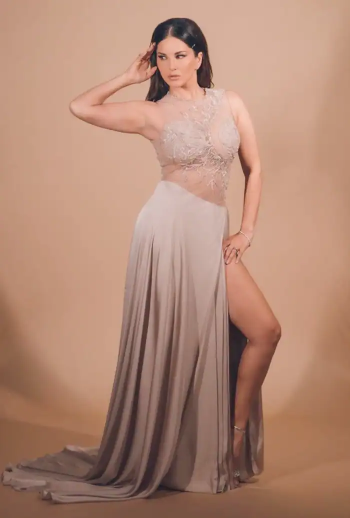 Sunny accessorized her look with diamond earrings, a bracelet, and a ring. She completed her look with silver heels, smokey eyes, and nude lips. She looked elegant and glamorous as she posed for the camera.