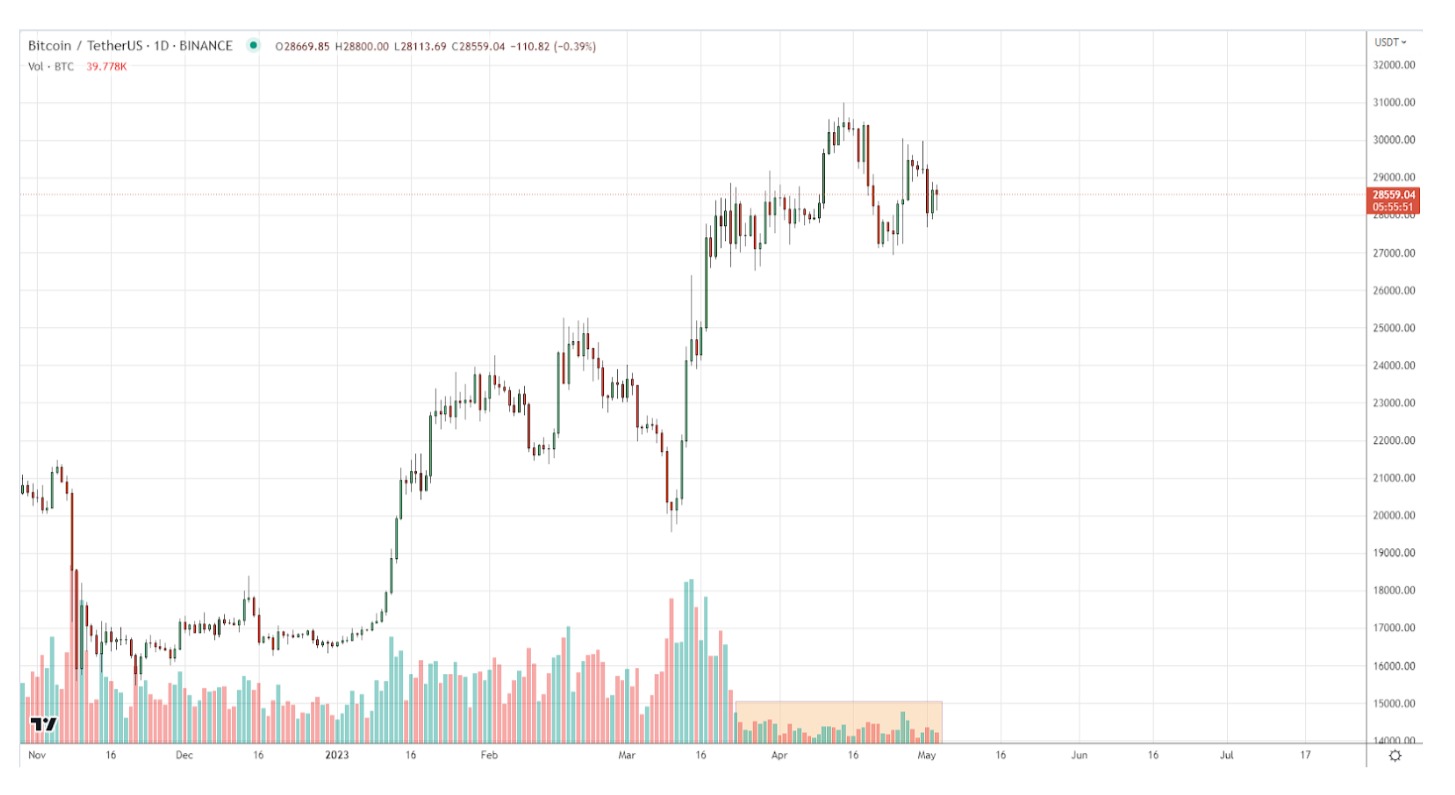 Bitcoin trading volume has decreased by almost 60% compared to previous months. And as of April 14, its rate reached $31,000. We saw such a price for the last time on June 8, 2022, at the moment when the price went to the next round of falling. We can jump to the conclusion that a significant drop in trading volume after a sharp rise in the rate may indicate that investors are taking a wait-and-see approach or transferring their capital to other cryptocurrencies.