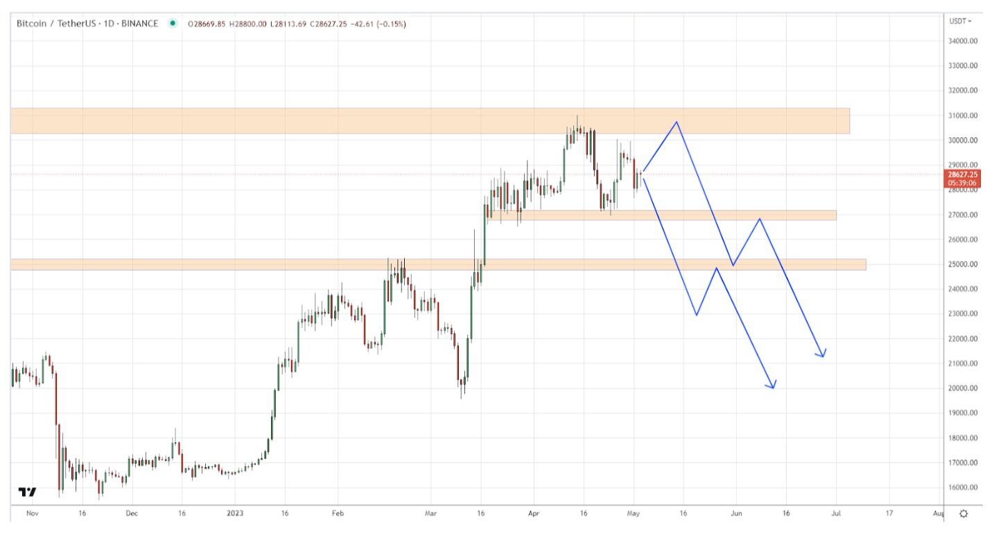 Bears, on the contrary, can allow testing $31,000 again and go for a breakdown of $25,000 – $27,000 with the potential for a further fall.