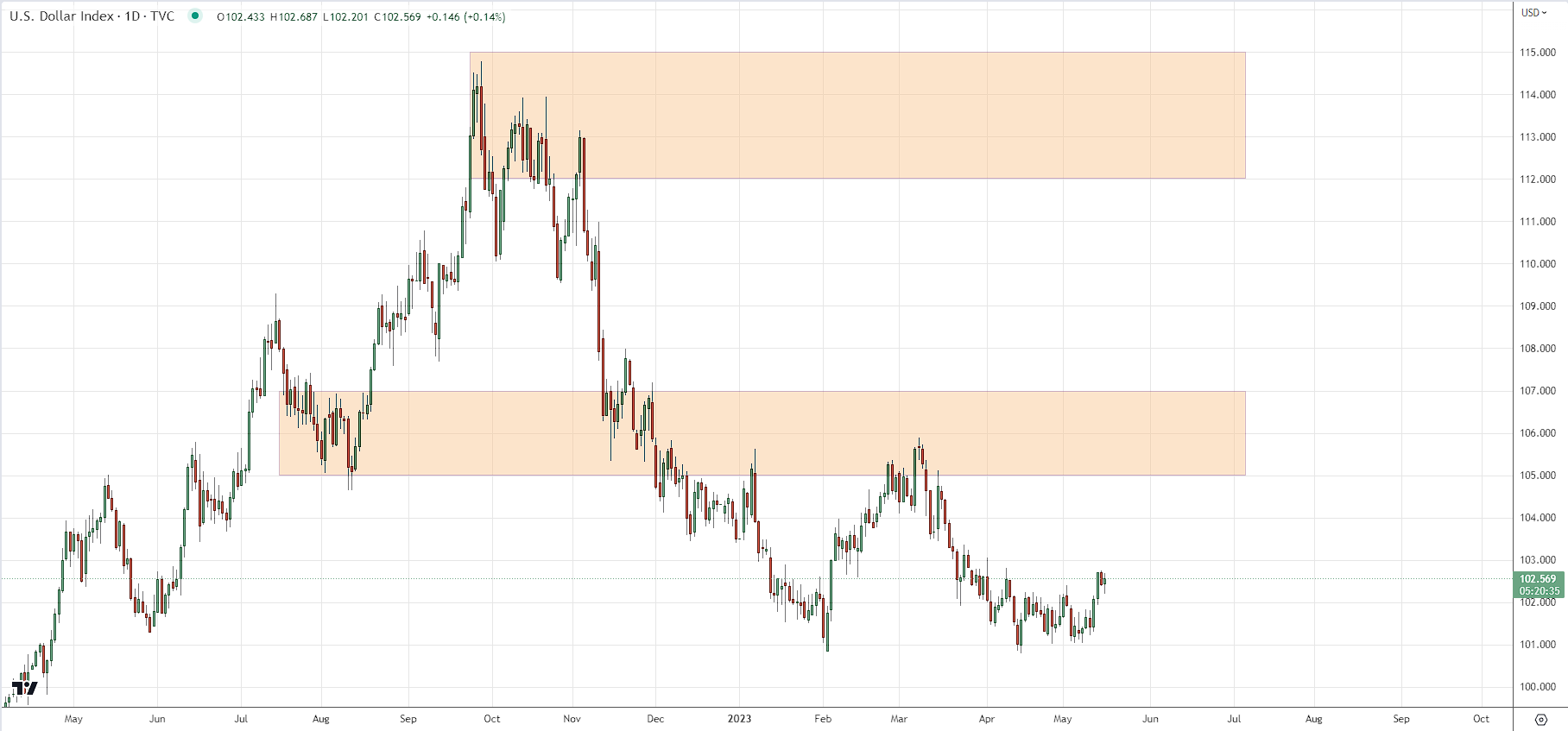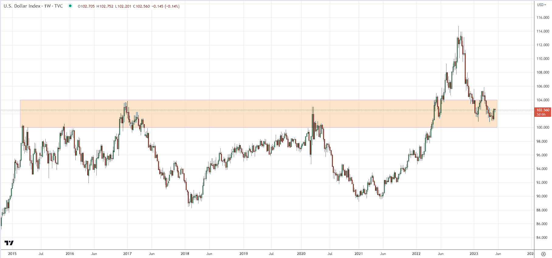 The index is currently at a significant level that has been both support and resistance on multiple occasions, and it is currently acting as support again. This is a range from 100 to about 104, as evident on the weekly chart. And until this range is broken, there is absolutely no point in looking for support below that level. Usually, if strong levels break through, it leads to a significant shift without much effect that from all the following levels until the price stops for other reasons. And as soon as it halts, it may twitch up and down for some time, until supply and demand reach a certain equilibrium. If a default were to occur, it is highly likely that the index would drop well below 100.