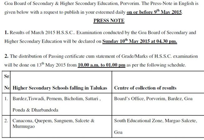 The Goa Board of Secondary and Higher Secondary Education (GBSHSE) will publish the results for Higher Secondary School Certificate examinations on May 10 on official website at 4.30 p.m.