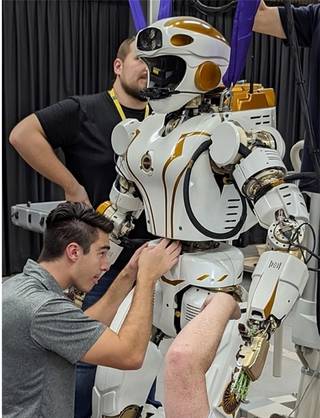 Valkyrie is a bipedal robot that can walk, climb, and manipulate objects with its hands. It has a head-mounted camera, a chest-mounted LIDAR, and other sensors to perceive its environment. It can also communicate with humans using speech and gestures.