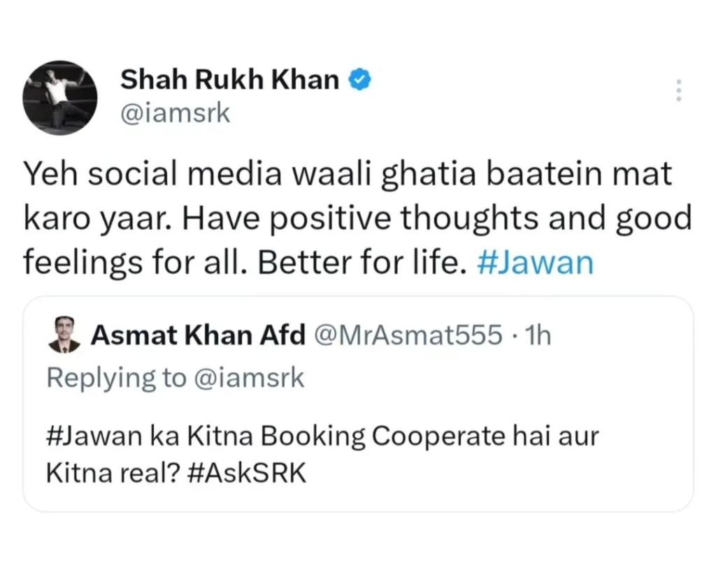 “The user was asked the following question: “#Jawan ka kitna reservation insignia hai aur kitna real (what is Jawan) before the reservation number is real, how many are fake)? #AskSRK” Shah Rukh replied, “Yes, social media waali ghatia baatein matte tile yaar (bad talk).