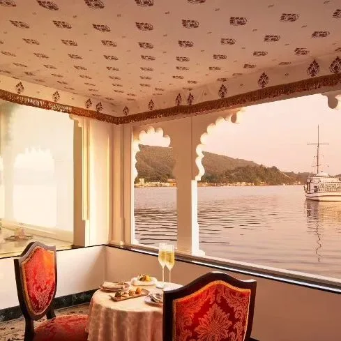 The Leela Palace is located on the banks of Lake Pichola and offers stunning views of the lake and the surrounding Aravalli Hills. The hotel is known for its opulent architecture and interiors, as well as its world-class amenities and services.