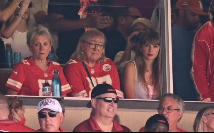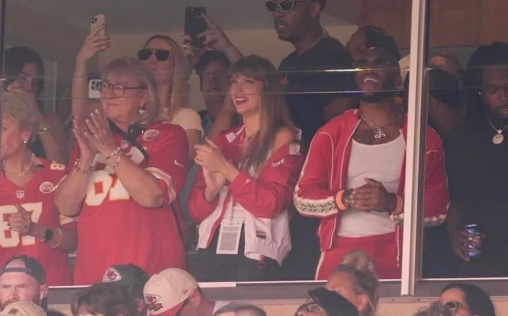 Swift was first spotted in the suite at the start of the game, seated next to Kelce’s mother, Donna. She was decked out in Chiefs gear, including a red jersey and white hat. Swift was very animated throughout the game, cheering on the Chiefs and celebrating Kelce’s touchdown catch in the third quarter.