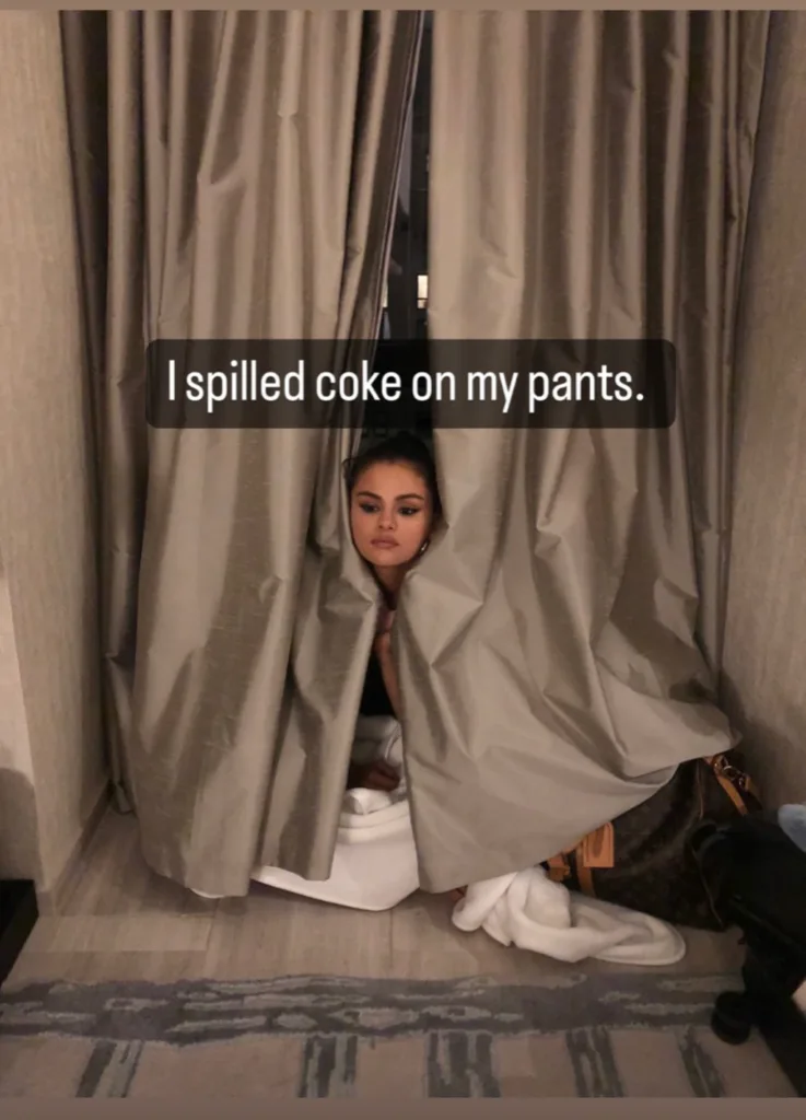 Selena Gomez revealed on social media that she unintentionally spilled her beverage on her leggings while looking dejected and peeking out from behind 2 curtains. And Gomez decided to take the literal approach to erasing the stain.
