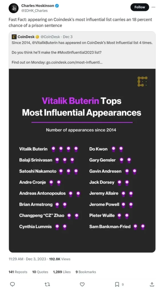 So, while Hoskinson might not have made CoinDesk’s list of “Most Influential People in Crypto,” he can rest assured that he is still top of mind for the crypto community, even if it’s for all the wrong reasons.
