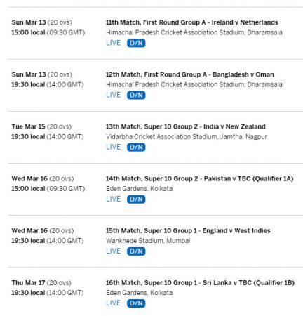 Match 01: Zimbabwe VS Hong Kong, 03.00 PM IST, March 08, 2016 (Vidarbha Cricket Association Stadium, Nagpur).