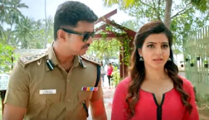 “Theri”, directed by Atlee and produced by Kalaipuli S Dhanu, features, Vijay, Amy Jackson and Samantha in lead roles.
