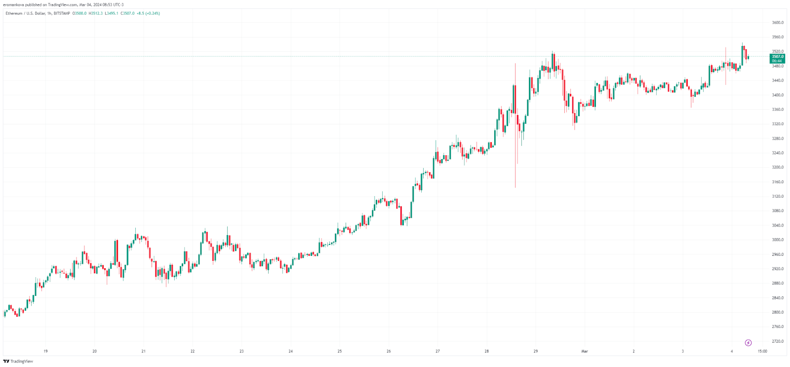Despite numerous applications and investor interest, the Ethereum ETF has yet to secure approval from key regulators. Nonetheless, the possibility of SEC approval for spot exchange-traded funds tied to Ethereum has bolstered the attractiveness of the second-largest cryptocurrency among investors. The cryptocurrency’s token price surpassed $3000 on February 20 for the first time since April 2022. The price has remained above this resistance level, with the next significant resistance levels anticipated at $3590-$3980. Once these levels are reached, a correction for further growth may ensue, with the depth of the correction contingent upon subsequent price formations.