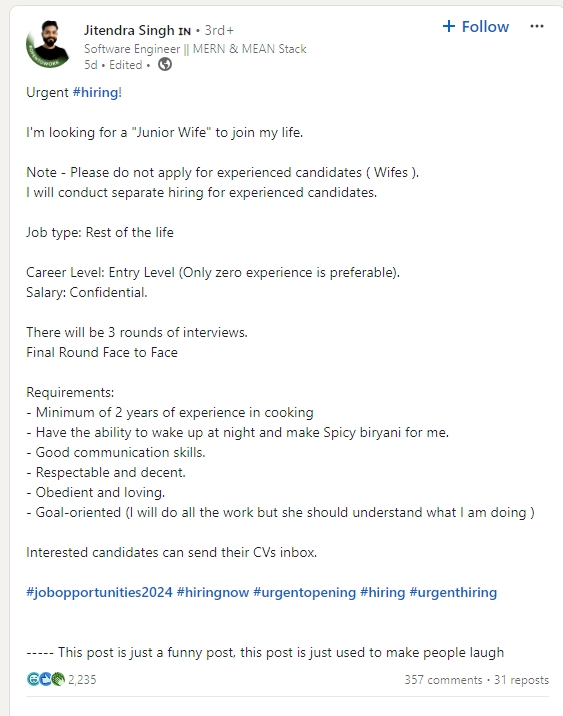 Many people had mixed reactions to this. Singh wrote when he shared the post: “Hiring quickly! I’m looking for a “little lady” to join my life. Remember – please do not apply to competitors (women). I will purchase separately for experienced people. Type of work: Rest of life. Job Level: Entry (no experience preferred). Salary: Confidential.