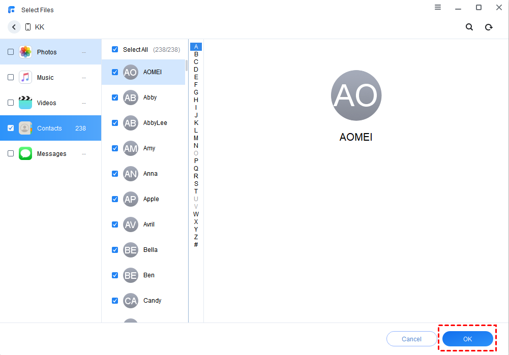 Step 3. Select the contacts you want to transfer > Click OK to continue.