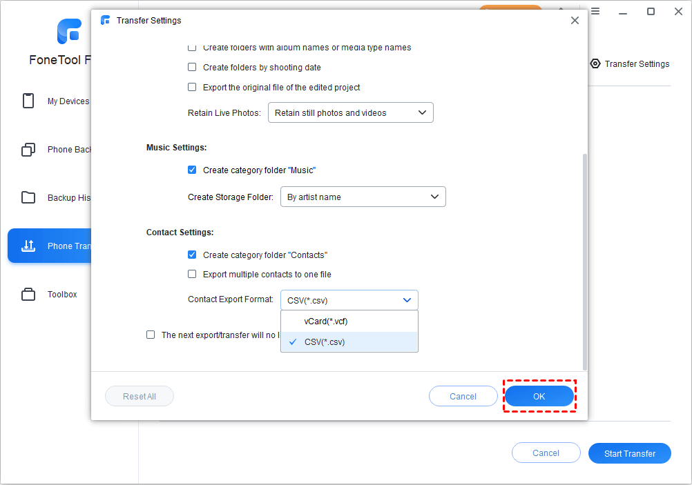 Step 4. Tap Start Transfer > On the Transfer Settings, you can select the format (vCard/CSV) and choose a path to save your contacts > Finally, click Transfer to start.