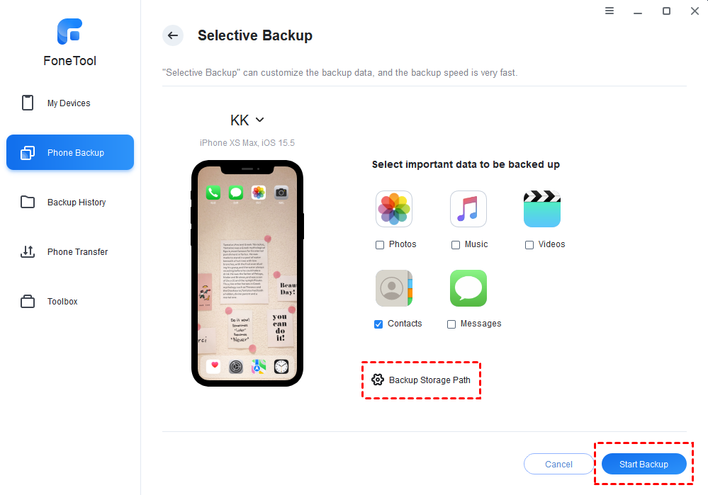 Step 4. After that, set the backup path in the Backup Storage Path > Tap the Start Backup button and it will begin the transfer.