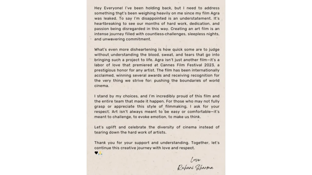 Ruhani Sharma took to Instagram to share a lengthy and heartfelt statement in response to the controversy. She expressed her disappointment and heartbreak over the leak, emphasizing the hard work and dedication that went into creating the film. “Creating an art film is an intense journey filled with countless challenges, sleepless nights, and unwavering commitment,” she wrote.