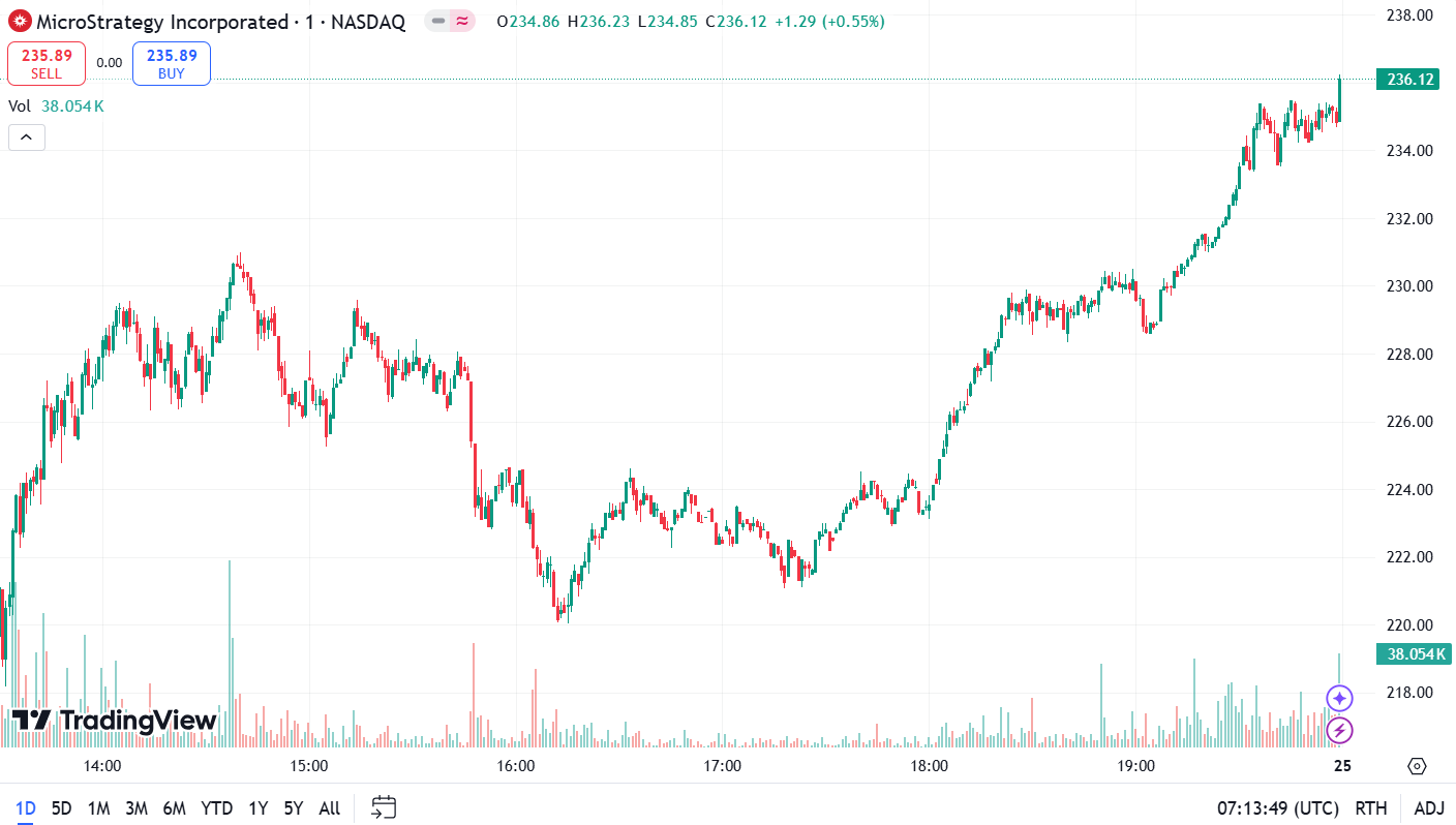 MicroStrategy’s stock has experienced a remarkable surge, jumping over 7.8% in the last 24 hours to reach approximately $236.12, marking a new 25-year high. This impressive rise is closely tied to the ongoing surge in Bitcoin prices.