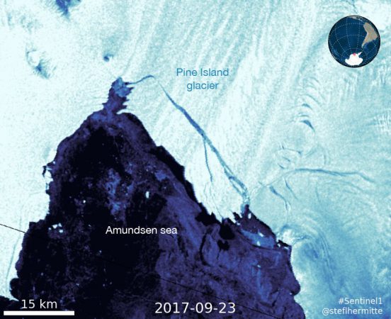 The huge chunk of the ice which broke off from the floating edge of the Pine Island Glacier in West Antarctica on September 23rd is a part of the gargantuan West Antarctic Ice Sheet and if the ice sheet gets dislodged, it can raise the sea levels by 10 feet over a period of time. The Glacier restrains almost 10 percent of the West Antarctic Ice Sheet from going into the sea and this can be seen clearly in an image from the Sentinel-1 satellite which was posted by Stef Lhermitte, a remote sensing expert at the Delft University of Technology in the Netherlands.