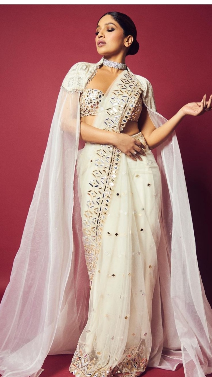 Bhumi looked pretty in a black-and-white tie-dye saree featuring embroidery on the border