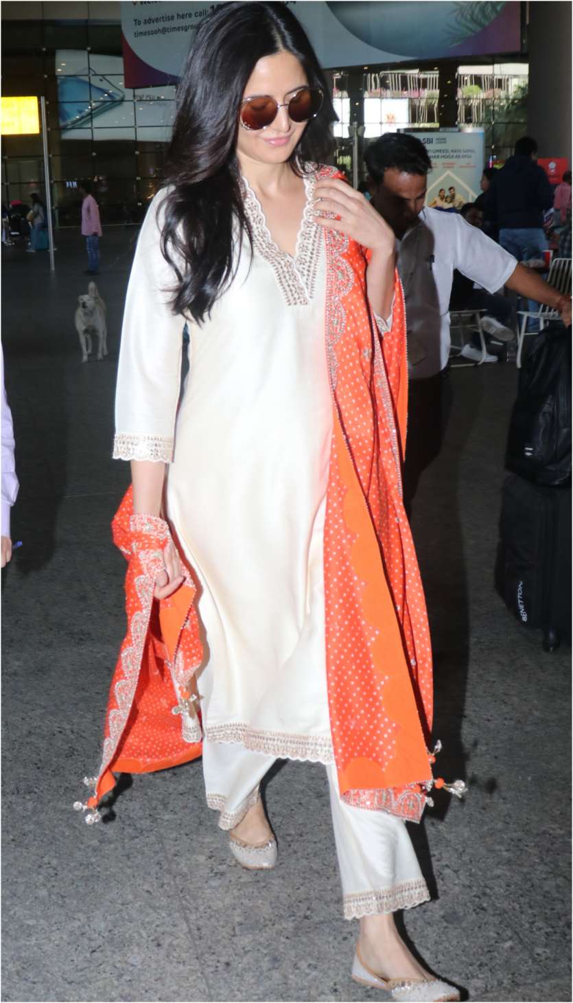 Kaif wore an oversized beige kurta with an orange dupatta.