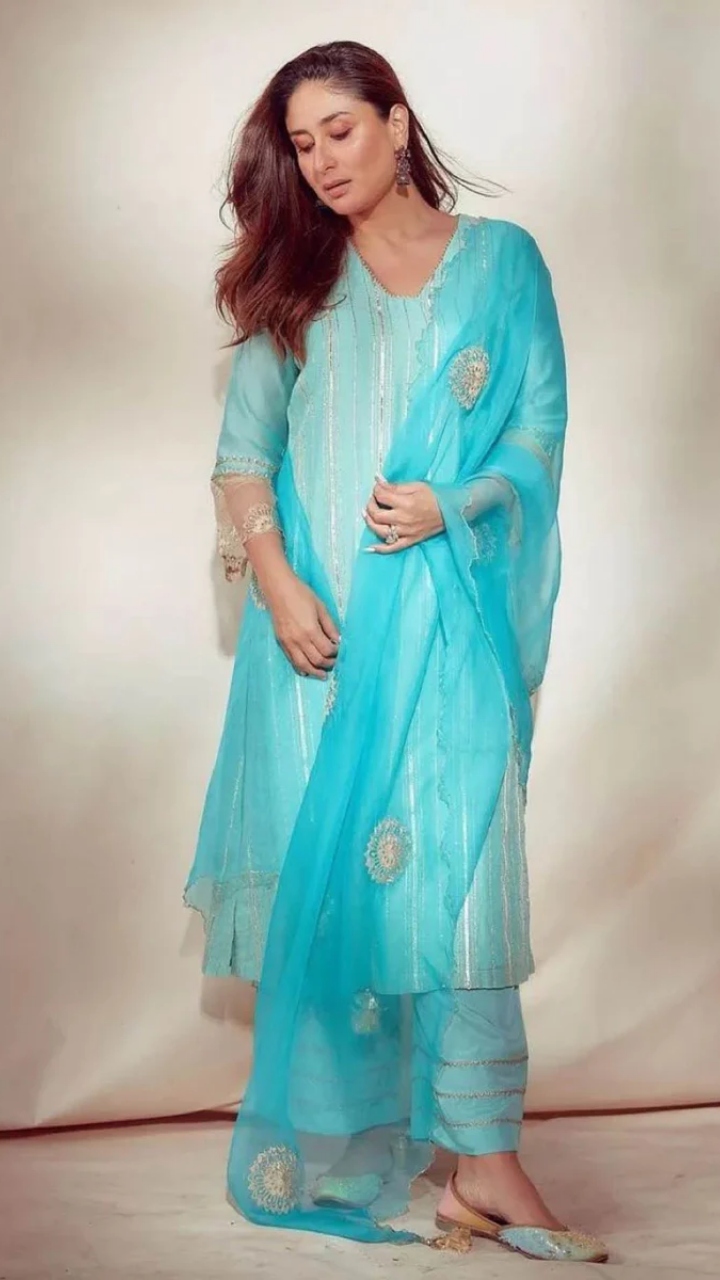 Aishwarya looked stunning in a powder blue-hued plain 'kurta'.