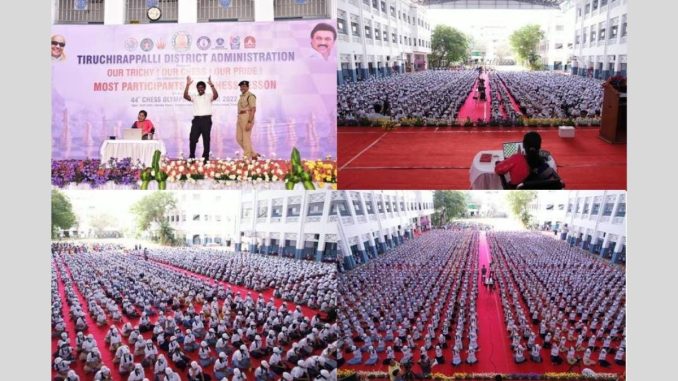 The Tiruchirappalli District Administration managed to execute an event titled “Our Trichy! Our Chess! Our Pride! on account of celebrating the 44th FIDE International Chess Olympiad to be held at Chennai late this month. The District Administration was able to assemble 2140 school students on July 16, 2022, at Campion Anglo Indian Higher Secondary School, where in Ms K.Jennitha Anto, Women International Chess Master handled the Chess Lesson for 2140 participants. This feat has earned the District a place in Elite World Records, Asian Records Academy, India Records Academy and Tamilan Book of Records for the title “Most Participants in a Chess Lesson (Single Location)”.