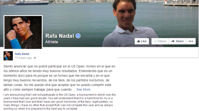 Just one week before play begins at Flushing Meadows, Nadal announced his withdrawal due to a bad right wrist. Nadal posted on his Facebook page that it is a very tough moment for him to leave a tournament he loves and where he has great memories from fans and the night matches. He promised to work harder in order to be able to compete at the highest level once he is back.