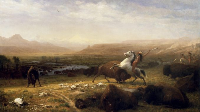 In his painting The Last of Five Buffalo Bulls on the Plains, Albert Bierstadt artwork shows several buffalos fighting one another with a cliff in the background. He chose to show dead animals with no humans present so that the viewer could empathize with nature.