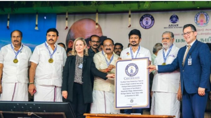 Dindigul District Administration in association with Hindu Religious and Charitable Endowments Department, TamilNadu Agricultural University, Tamil Nadu Forest Department and Ever Green City Club executed a massive tree plantation drive by planting 6.03 lakhs trees in 4 hours at Idayakottai Village of Oddanchatram Constituency in Dindigul District, involving 16500 volunteers on December 23, 2022, in a bid to honour a mission “Green Tamil Nadu” Initiated by Chief Minister of TamilNadu.