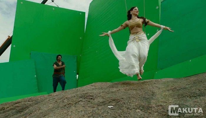 In the video, we can see a broken down form of all the scenes that were computer generated, especially the first scene, where a baby was carried by Ramya Krishnan in her palm while she was in a river with heavy current.