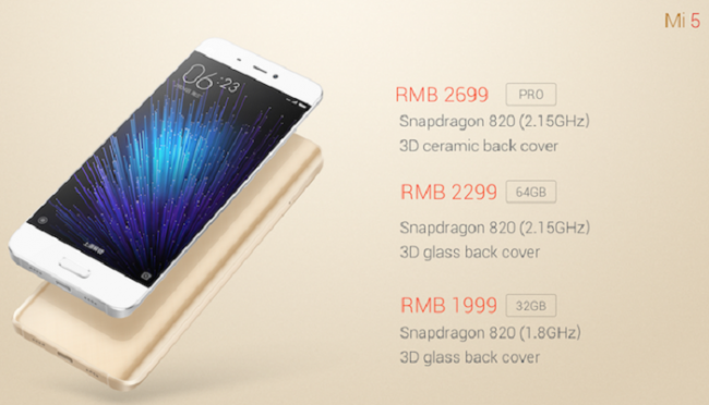 Mi 5 comes in three models; 64 GB model with a price tag of Rs. 24,111, 32 GB model has Rs.20,965, and Mi 5 Pro has a price tag of Rs. 28,307.