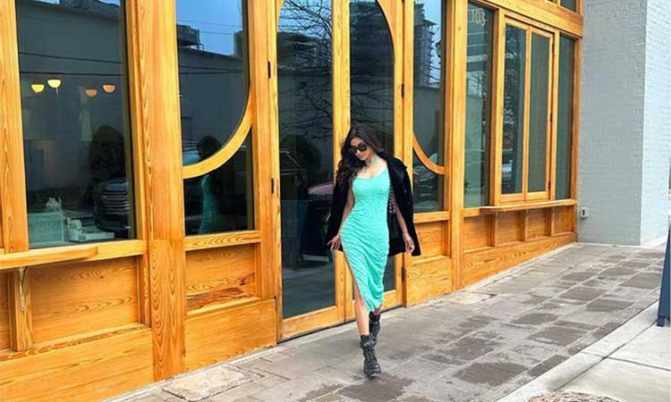 Mouni Roy cuddling with a golden retriever puppy in Atlanta,Georgia